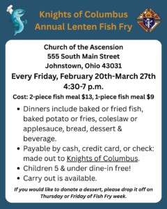 Johnstown, Ohio – February 6, 2026 – The Knights of Columbus at Church of the Ascension invites the community to join them for their traditional Annual Lenten Fish Fry, a beloved Lenten tradition offering delicious, affordable meals every Friday during the season of Lent.