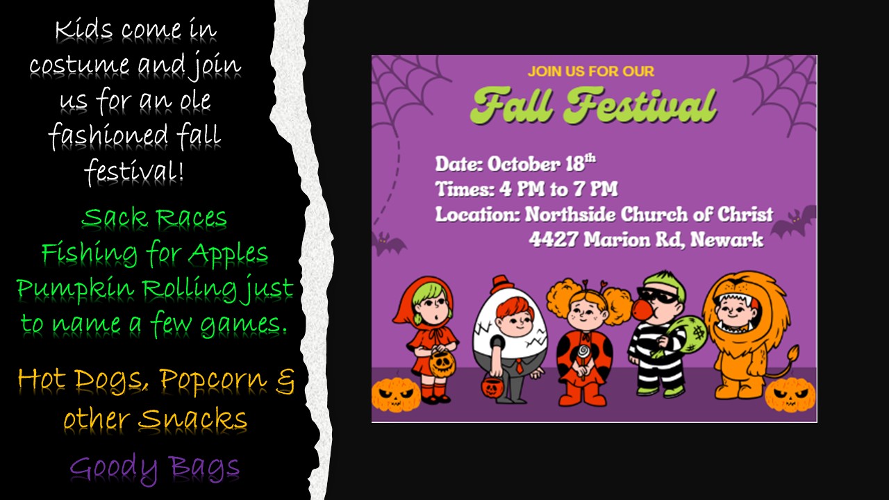 Kids come in costume and join us for an ole fashioned fall festival. Sack races, pumpkin rolls, fishing for apples are just a few of the games. Hot dogs, popcorn, other snacks, and goody bags.